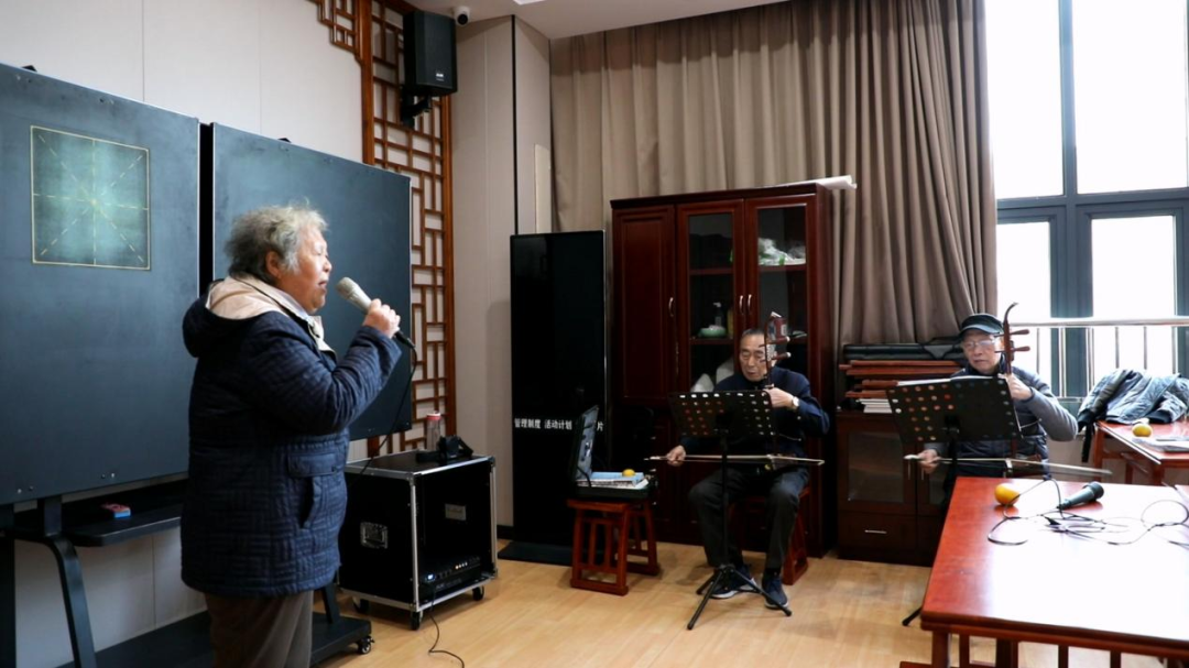 每周三下午2点半,安徽池州市民汪青都会准时来到贵池区新时代文明实践中心三楼声乐室,这里常常早已聚集了其他几个戏迷票友,等着他的高胡开奏排练黄梅戏。汪青调试完琴弦,随着高胡明亮清澈的音调响起,一旁的票友也唱起黄梅戏《天仙配》选段。今年72岁的汪青早年一直在池州文工团演出,退休后因为喜爱黄梅戏,开始学习演奏高胡,和朋友们组了一个黄梅调交流小组,因为没有固定场地排练,只好在小区楼下、广场等地方练习交流,很是不便。