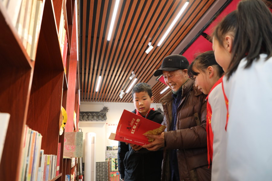 巴中市通江县沙溪镇王坪村村民王绍琼为少先队员讲述红军故事。通江县文明办供图