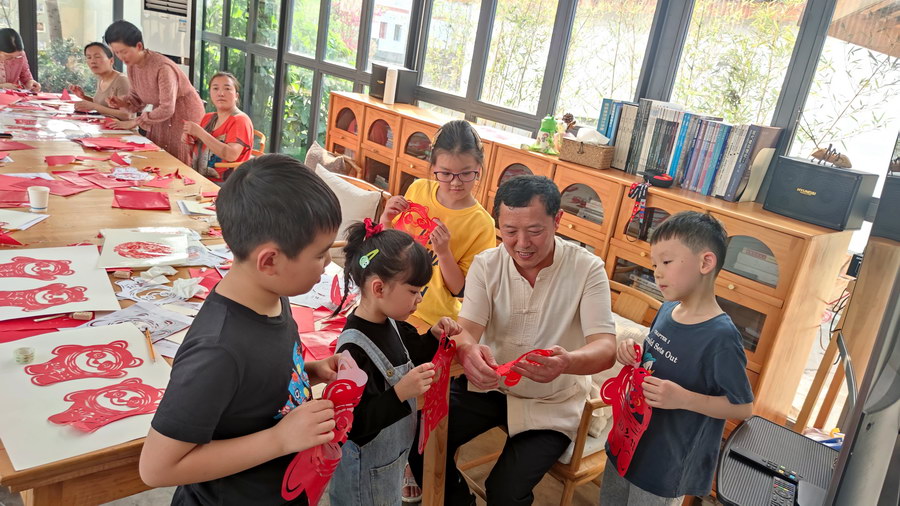资阳市雁江区保和镇晏家坝村非遗工坊里,村民在学习东风剪纸。晏家坝村委会供图